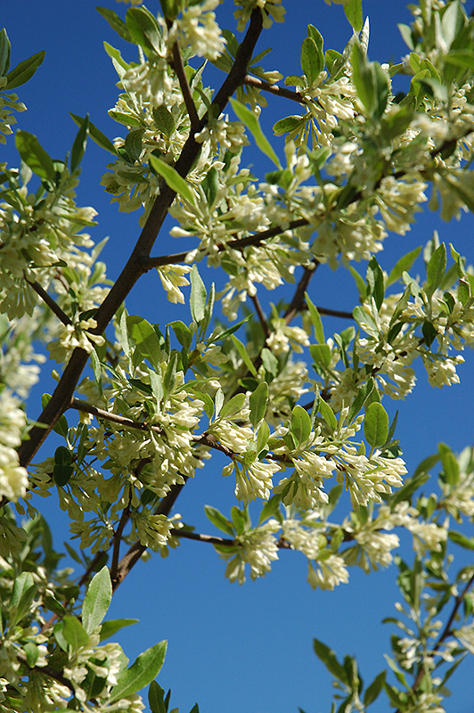 Silverberry has attractive silver deciduous foliage on a plant with an upright spreading habit of growth. The fuzzy narrow leaves are highly ornamental but do not develop any appreciable fall colour. It features subtle fragrant buttery yellow bell-shaped flowers along the branches in late spring.