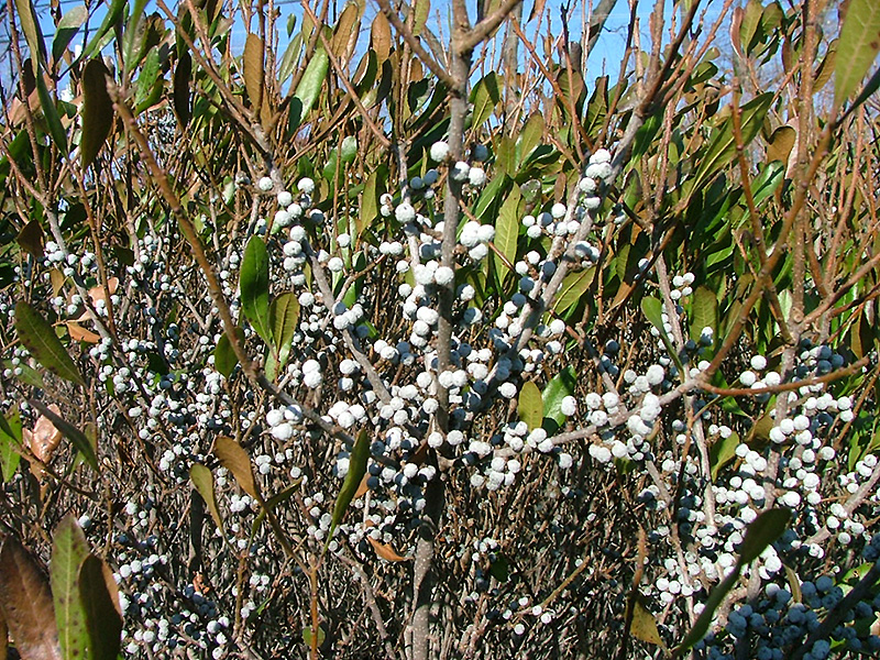 A vigorous variety known for its unusual small, waxy gray fruit which tightly hug the branches through the winter; thrives in poor, sandy or gravely acidic soils, some suckering, excellent for massing; fruit are often used for candles