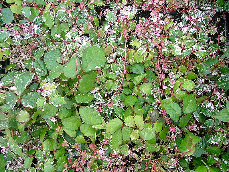 One of the showiest of the landscape vines with very attractive green and white variegated leaves edged in pink, small dark blue berries, excellent for screening everything from fences and arbors to homes and buildings; self-clinging, tough and adaptable