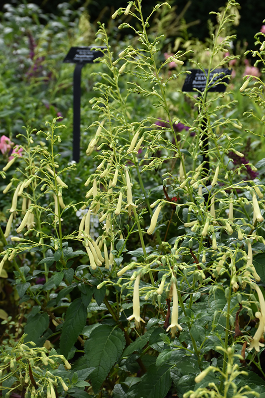 A striking variety featuring nodding cream trumpet flowers against the blue-green foliage; very attractive to hummingbirds; a dense self supporting round shrub that can be treated as a tender perennial in colder areas