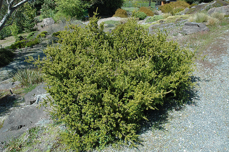 This is a showy mounded evergreen shrub with very noticeable reddish new growth atop the older blue-green needles; changes to a reddish-purple in late fall; adds a wonderful texture to a border or rock garden