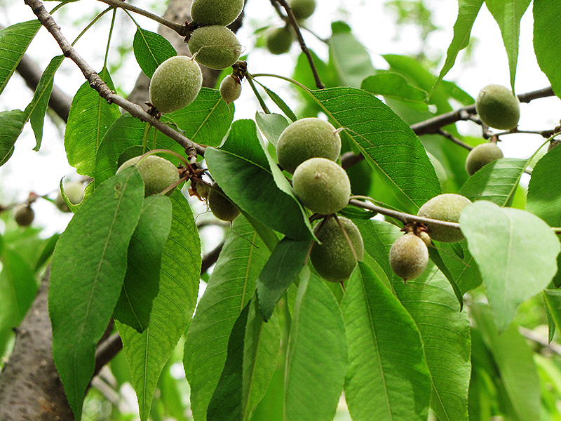 A hardy ornamental peach, with showy white flowers in spring, and a large rounded habit; will tolerate some shade but needs full sun most of the time and well-drained soil; the furry fruits are small, dry and tasteless