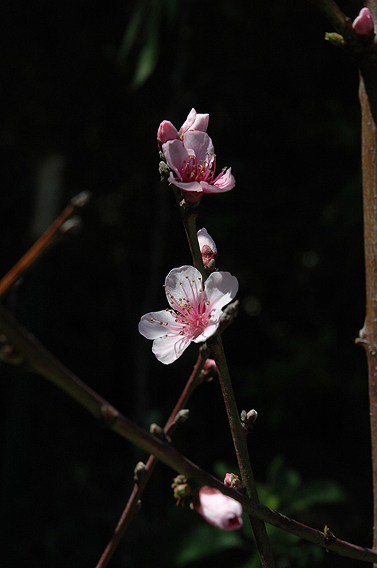 Q-1-8 White Peach is smothered in stunning clusters of fragrant shell pink flowers along the branches in early spring, which emerge from distinctive red flower buds before the leaves. It has dark green deciduous foliage. The narrow leaves turn yellow in fall. The fruits are showy yellow drupes with a red blush, which are carried in abundance from early to mid summer. The fruit can be messy if allowed to drop on the lawn or walkways, and may require occasional clean-up.