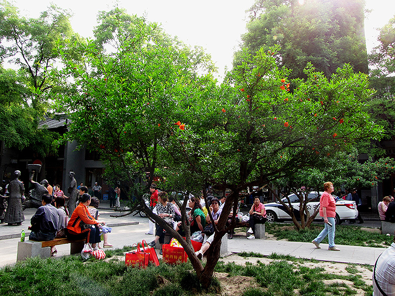 Pomegranate has nodding orange trumpet-shaped flowers at the ends of the branches from early to late summer, which emerge from distinctive tomato-orange flower buds, and which are interesting on close inspection. It has dark green deciduous foliage. The glossy oval leaves do not develop any appreciable fall colour. The fruits are showy yellow pomes with a red blush, which are carried in abundance in early fall.
