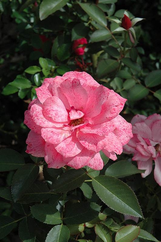 An attractive rose that features abundant pink flowers with yellow-gold centers; compact, upright habit, quite adaptable and resistant to disease, a valuable garden shrub; all roses need full sun and well-drained soil