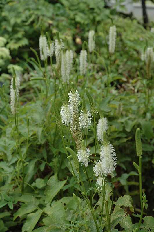 A clump forming wetland plant producing white bottlebrush-like flowers thru summer that are ideal for cutting, held atop attractive compound leaves; a pretty addition to the garden, or near water features