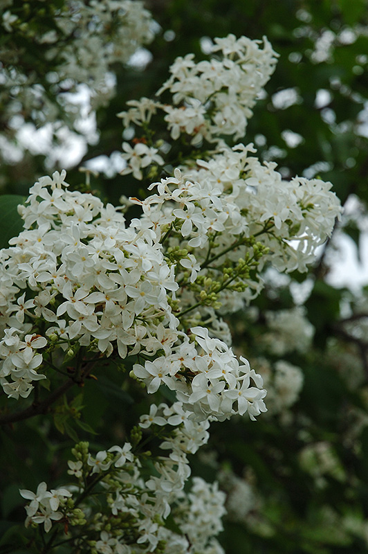 An exquisite lilac blanketed in upright panicles of fragrant snow-white flowers in early spring on an upright growing shrub, magnificent in bloom; needs full sun and well-drained soil, limited suckering, good disease resistance