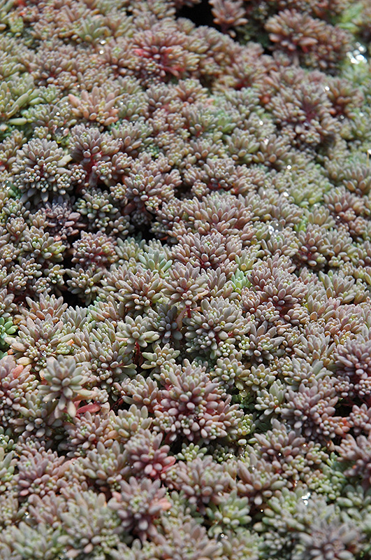 A compact groundcover stonecrop with white flowers held atop of blue-green foliage flushed with purple-red; a drought-tolerant perennial that does best in poor soils, an excellent choice for containers, edging and rock gardens