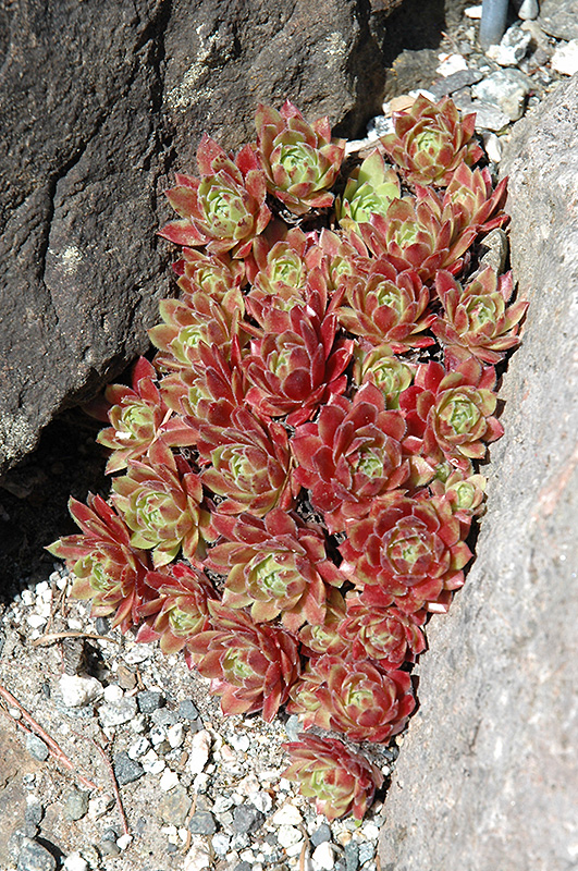 Gloriosum Hens And Chicks will grow to be only 4 inches tall at maturity extending to 10 inches tall with the flowers, with a spread of 12 inches. When grown in masses or used as a bedding plant, individual plants should be spaced approximately 10 inches apart. Its foliage tends to remain low and dense right to the ground. It grows at a medium rate, and under ideal conditions can be expected to live for approximately 20 years. As an herbaceous perennial, this plant will usually die back to the crown each winter, and will regrow from the base each spring. Be careful not to disturb the crown in late winter when it may not be readily seen!