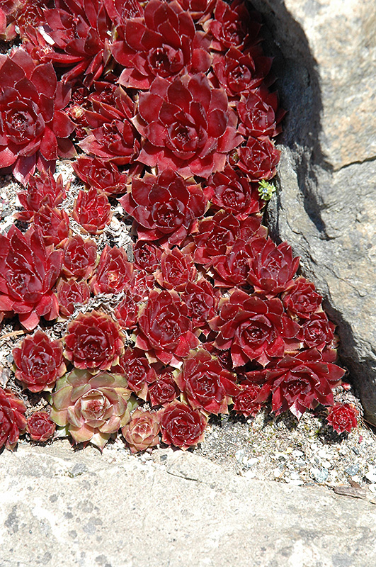 Granat Hens And Chicks will grow to be only 4 inches tall at maturity extending to 12 inches tall with the flowers, with a spread of 12 inches. When grown in masses or used as a bedding plant, individual plants should be spaced approximately 10 inches apart. Its foliage tends to remain low and dense right to the ground. It grows at a medium rate, and under ideal conditions can be expected to live for approximately 20 years. As an herbaceous perennial, this plant will usually die back to the crown each winter, and will regrow from the base each spring. Be careful not to disturb the crown in late winter when it may not be readily seen!