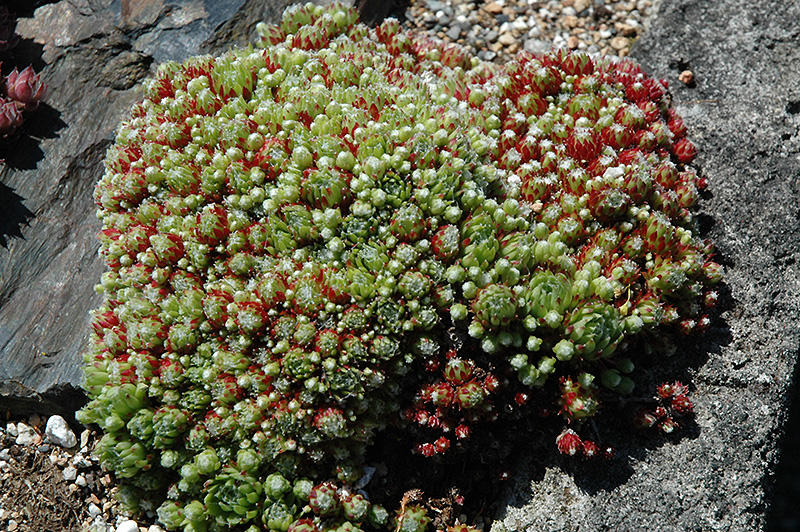 Hookeri Hens And Chicks will grow to be only 3 inches tall at maturity extending to 8 inches tall with the flowers, with a spread of 12 inches. When grown in masses or used as a bedding plant, individual plants should be spaced approximately 10 inches apart. Its foliage tends to remain low and dense right to the ground. It grows at a medium rate, and under ideal conditions can be expected to live for approximately 20 years. As an herbaceous perennial, this plant will usually die back to the crown each winter, and will regrow from the base each spring. Be careful not to disturb the crown in late winter when it may not be readily seen!