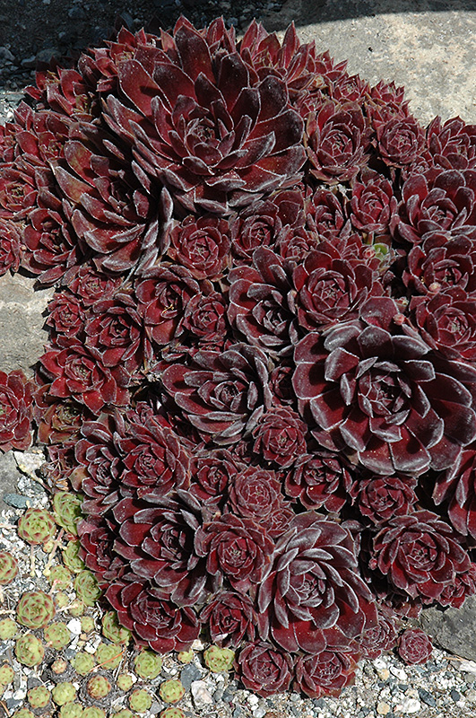 Ohio Burgundy Hens And Chicks will grow to be only 3 inches tall at maturity extending to 10 inches tall with the flowers, with a spread of 12 inches. When grown in masses or used as a bedding plant, individual plants should be spaced approximately 10 inches apart. Its foliage tends to remain low and dense right to the ground. It grows at a medium rate, and under ideal conditions can be expected to live for approximately 20 years. As an herbaceous perennial, this plant will usually die back to the crown each winter, and will regrow from the base each spring. Be careful not to disturb the crown in late winter when it may not be readily seen!