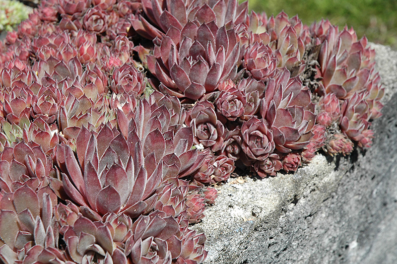 Purdy's Big Red Hens And Chicks will grow to be only 6 inches tall at maturity extending to 12 inches tall with the flowers, with a spread of 14 inches. When grown in masses or used as a bedding plant, individual plants should be spaced approximately 12 inches apart. Its foliage tends to remain low and dense right to the ground. It grows at a medium rate, and under ideal conditions can be expected to live for approximately 20 years. As an herbaceous perennial, this plant will usually die back to the crown each winter, and will regrow from the base each spring. Be careful not to disturb the crown in late winter when it may not be readily seen!