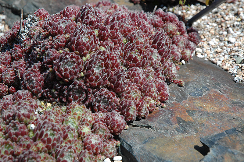 This selection has small rosettes with dense, symmetrical burgundy-purple leaves that mature more purple; rosettes are lightly cobwebbed with silver hairs; ideal for rock gardens and containers