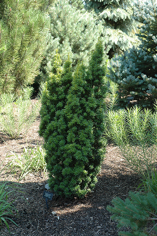 A wonderful evergreen color accent tree with radiant variegated needles of gold and green on a slow growing columnar form; interesting red berries, has numerous applications, takes pruning well
