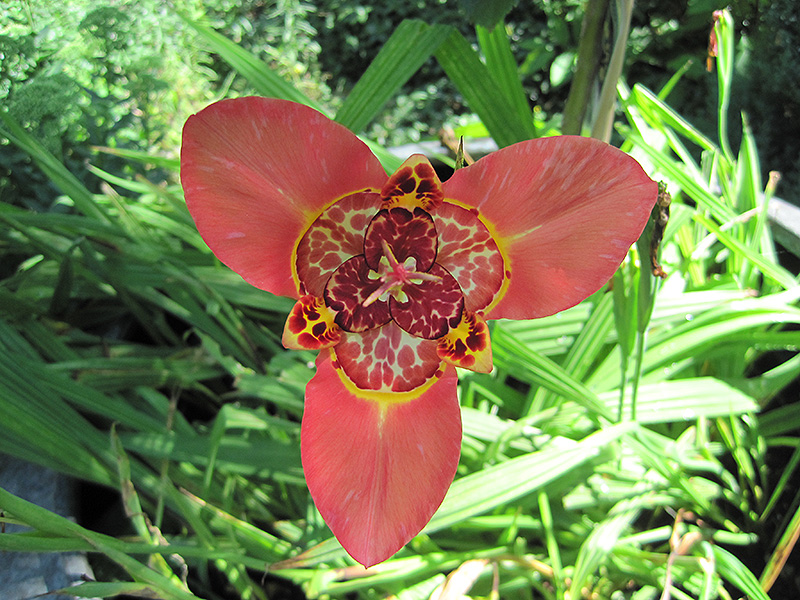 Rossa Tiger Flower will grow to be about 18 inches tall at maturity extending to 24 inches tall with the flowers, with a spread of 24 inches. When grown in masses or used as a bedding plant, individual plants should be spaced approximately 6 inches apart. Its foliage tends to remain dense right to the ground, not requiring facer plants in front. Although it's not a true annual, this plant can be expected to behave as an annual in our climate if left outdoors over the winter, usually needing replacement the following year. As such, gardeners should take into consideration that it will perform differently than it would in its native habitat.