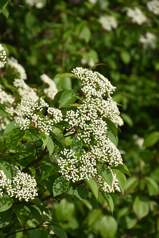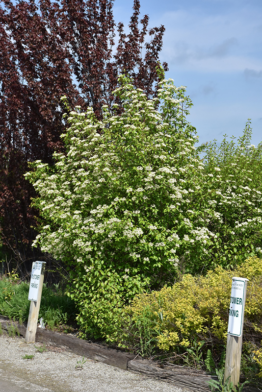 A graceful, vase shaped variety with showy clusters of creamy white flowers in spring, pinkish-red berries which fade to dark blue in fall and good fall color; a rigid large shrub or tree that is very attractive as a solitary specimen; disease resistant