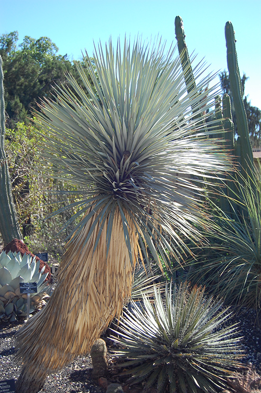 A succulent cactus-like shrub with beautiful blue-green spear-like leaves radiating from the center and tall spikes of nodding white flowers in autumn; once established, this variety is trunk forming; good for dry sites, use as a focal accent