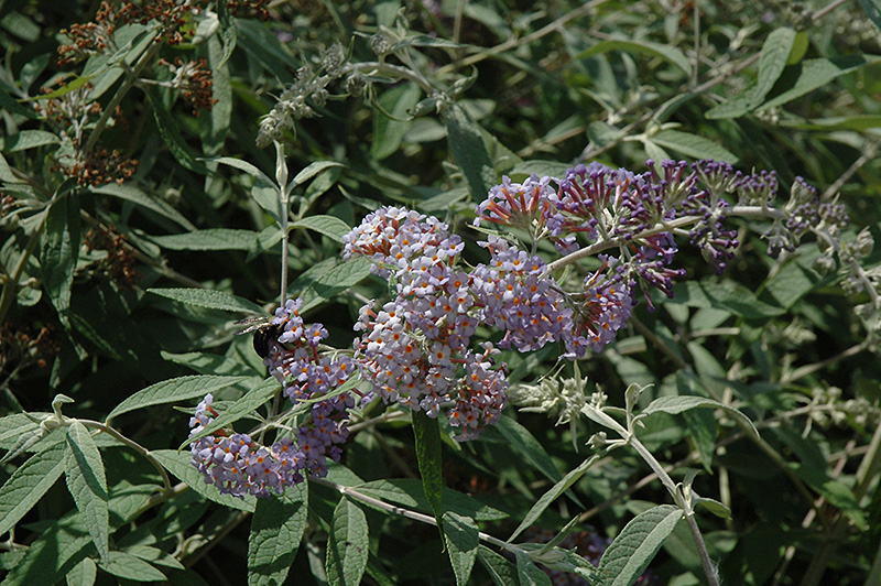 An elegant garden plant with full, cone shaped clusters of pink flowers with bright orange centers; attracts butterflies; may be cut back to the ground each spring, as it blooms on new wood; sterile and non-invasive hybrid