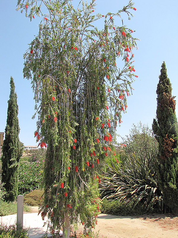 This gracefully weeping large shrub makes a unique addition to the landscape; its fine, gray-green foliage, gives it a soft appearance; branch ends are adorned with striking red bottlebrush flowers all season