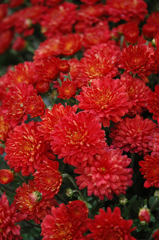 Hestia Hot Red Chrysanthemum is covered in stunning double red daisy flowers at the ends of the stems from early to late fall. The flowers are excellent for cutting. Its fragrant ferny leaves remain dark green in colour throughout the season.