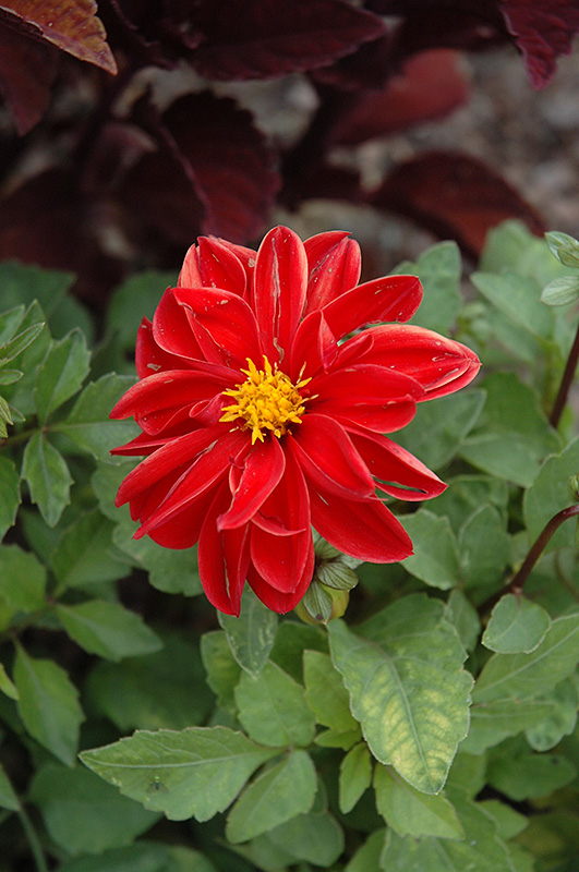 Figaro™ Red Shades Dahlia features showy semi-double red round flowers with gold eyes at the ends of the stems from mid summer to mid fall. The flowers are excellent for cutting. Its pointy leaves remain green in colour throughout the season.