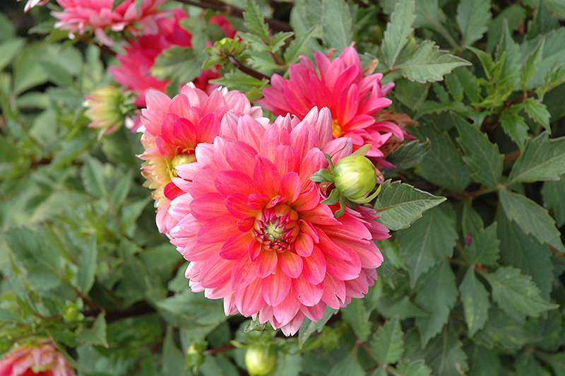 This spectacular dahlia is a prolific bloomer, producing masses of large hot pink flowers for a long period beginning in mid summer; wonderful along borders or in containers; not frost hardy