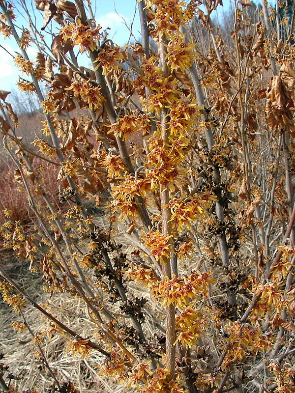 Nothing breaks the monotony of late winter like the highly fragrant witchhazel; this variety features long lasting gold strap-like flowers in tight bunches along the branches with burgundy centers and a wide-spreading habit of growth