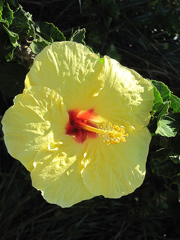 Hula Girl Hibiscus features bold yellow round flowers with red eyes at the ends of the branches from mid summer to early fall. Its glossy pointy leaves remain dark green in colour throughout the year.