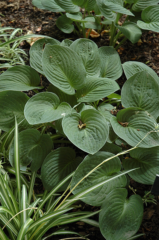 An outstanding variety with blue-green leaves are a widely rounded heart shape, lightly corrugated, and substantial; spikes of lilac colored flowers in early summer; a beautiful textural addition to the garden or border