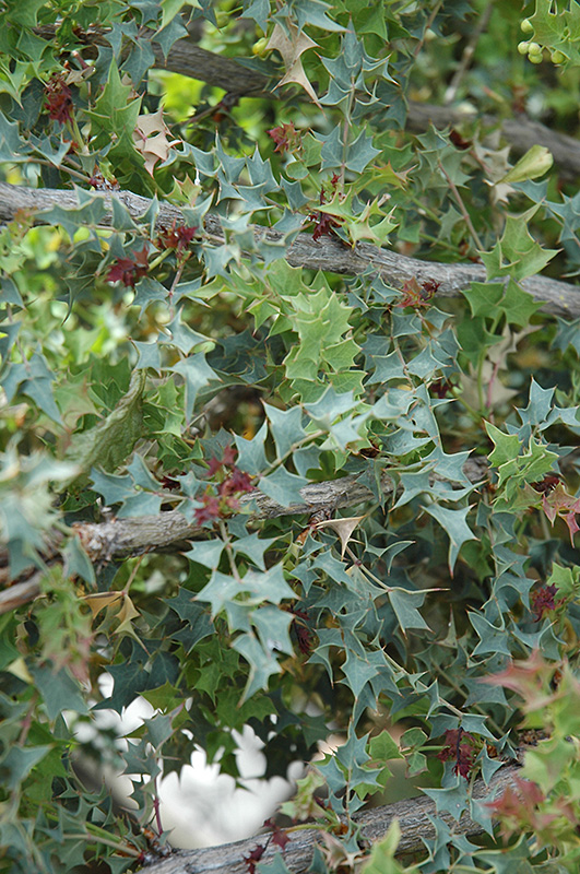 A mounded shrub with leathery, sharp holly-shaped leaves; showy yellow flowers in spring and attractive yellow grape-like fruit in late summer; regular pruning keeps this shrub dense and full