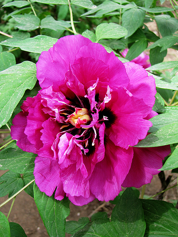 Lan Guan Yu Dai Tree Peony features bold lightly-scented double hot pink cup-shaped flowers with blue overtones, gold eyes and a black blotch at the ends of the branches from mid to late spring. The flowers are excellent for cutting. It has green deciduous foliage. The compound leaves do not develop any appreciable fall colour.