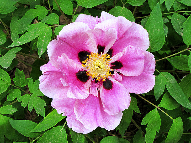 Shan Hai Guan Tree Peony features bold lightly-scented semi-double hot pink cup-shaped flowers with white overtones, gold eyes and a black blotch at the ends of the branches from mid to late spring. The flowers are excellent for cutting. It has green deciduous foliage. The lobed compound leaves do not develop any appreciable fall colour.