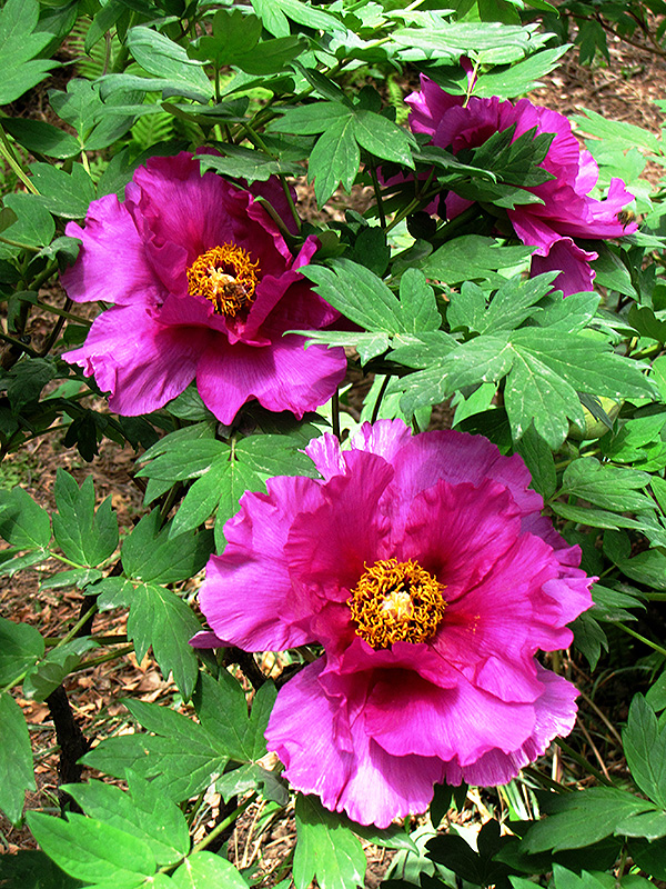 Brocaded Gown Tree Peony features bold lightly-scented semi-double purple cup-shaped flowers with pink overtones and gold eyes at the ends of the branches from mid to late spring. The flowers are excellent for cutting. It has green deciduous foliage. The narrow compound leaves do not develop any appreciable fall colour.