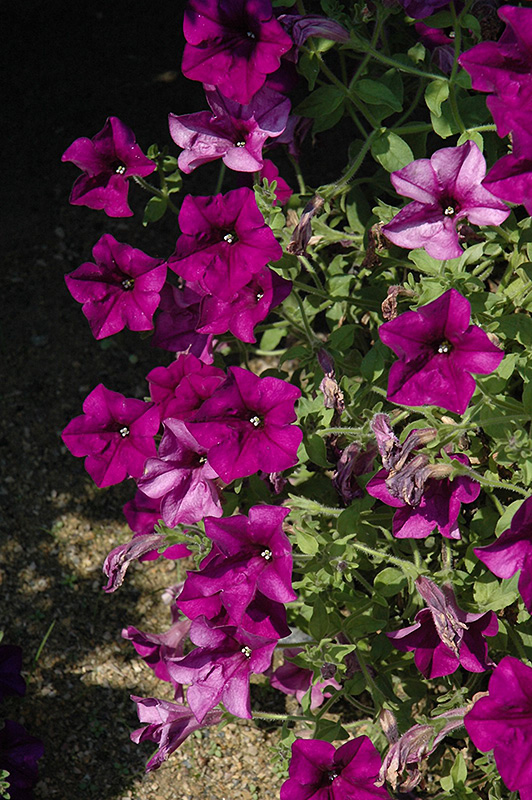 Glow Amethyst Petunia is clothed in stunning purple trumpet-shaped flowers at the ends of the stems from mid spring to mid fall. Its pointy leaves remain green in colour throughout the season.