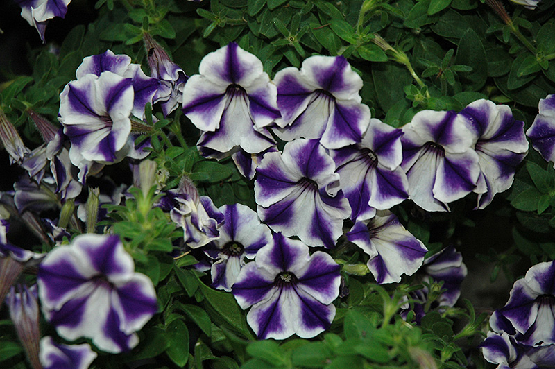 Glow Blue Stardust Petunia is draped in stunning white trumpet-shaped flowers with purple stripes at the ends of the stems from mid spring to mid fall. Its pointy leaves remain green in colour throughout the season.