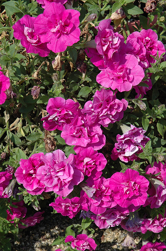 Glow Double Pink Vein Petunia is blanketed in stunning double hot pink trumpet-shaped flowers with rose veins at the ends of the stems from mid spring to mid fall. Its pointy leaves remain green in colour throughout the season.