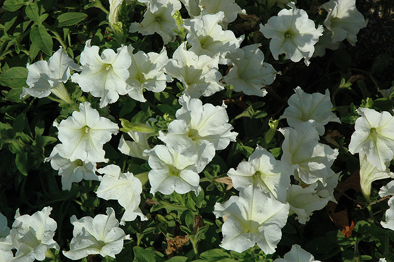 Glow Lime Petunia is blanketed in stunning white trumpet-shaped flowers with lime green centers at the ends of the stems from mid spring to mid fall. Its pointy leaves remain green in colour throughout the season.