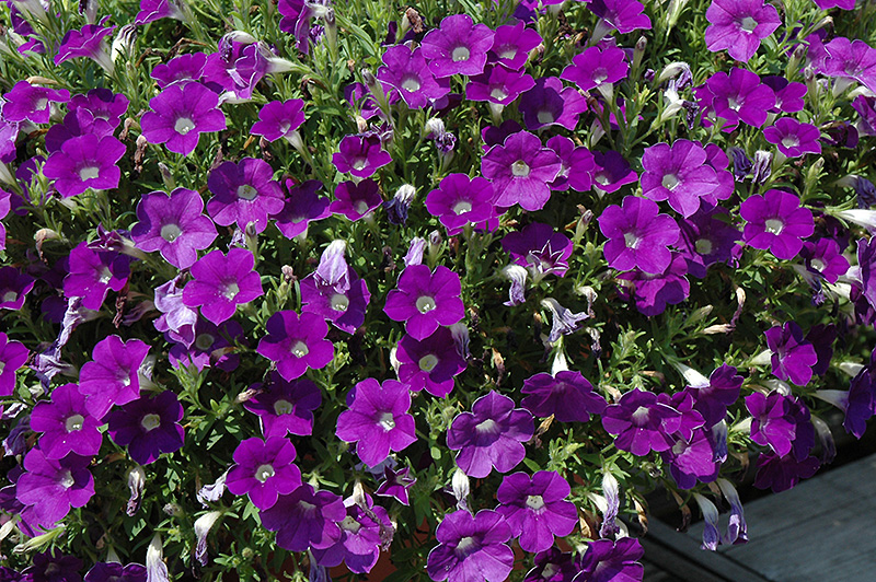 Surfinia® Bouquet Denim Petunia will grow to be only 6 inches tall at maturity, with a spread of 18 inches. When grown in masses or used as a bedding plant, individual plants should be spaced approximately 15 inches apart. Its foliage tends to remain low and dense right to the ground. This fast-growing annual will normally live for one full growing season, needing replacement the following year.