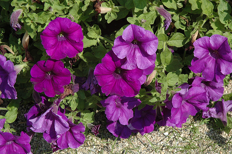 Surfinia® Giant Blue Petunia will grow to be only 6 inches tall at maturity, with a spread of 12 inches. When grown in masses or used as a bedding plant, individual plants should be spaced approximately 10 inches apart. Its foliage tends to remain low and dense right to the ground. This fast-growing annual will normally live for one full growing season, needing replacement the following year.