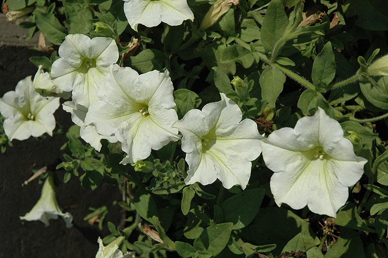 Surfinia® Lime Petunia is covered in stunning white trumpet-shaped flowers with lime green centers at the ends of the stems from mid spring to mid fall. Its pointy leaves remain green in colour throughout the season.