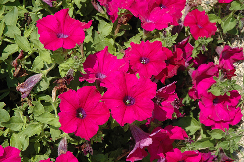 Surfinia® Magenta Petunia will grow to be only 6 inches tall at maturity, with a spread of 12 inches. When grown in masses or used as a bedding plant, individual plants should be spaced approximately 10 inches apart. Its foliage tends to remain low and dense right to the ground. This fast-growing annual will normally live for one full growing season, needing replacement the following year.