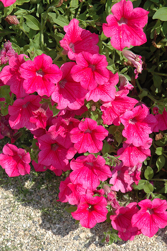 Surfinia® Rose Vein Petunia is smothered in stunning pink trumpet-shaped flowers with hot pink overtones and rose veins at the ends of the stems from mid spring to mid fall. Its pointy leaves remain green in colour throughout the season.