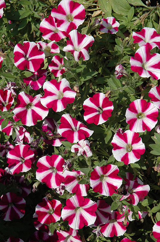Cascadias Bicolor Burgundy Petunia is bathed in stunning burgundy trumpet-shaped flowers with white stripes at the ends of the stems from mid spring to late summer. Its pointy leaves remain green in colour throughout the season.