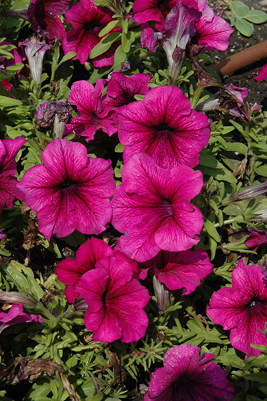 Limbo Plum Petunia is clothed in stunning plum purple trumpet-shaped flowers with crimson veins at the ends of the stems from mid spring to mid fall. Its pointy leaves remain green in colour throughout the season.