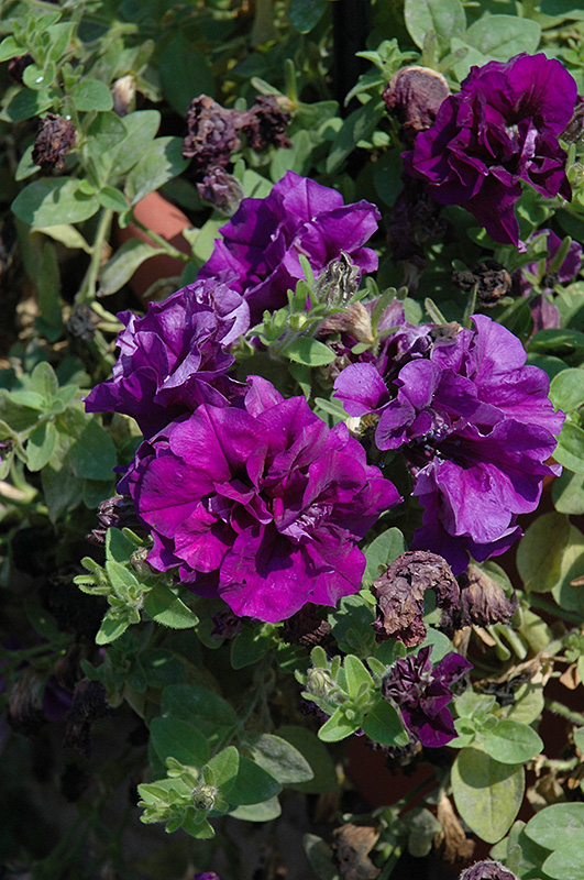 Double Wave Blue Velvet Petunia will grow to be about 12 inches tall at maturity, with a spread of 20 inches. When grown in masses or used as a bedding plant, individual plants should be spaced approximately 15 inches apart. Its foliage tends to remain dense right to the ground, not requiring facer plants in front. This fast-growing annual will normally live for one full growing season, needing replacement the following year.