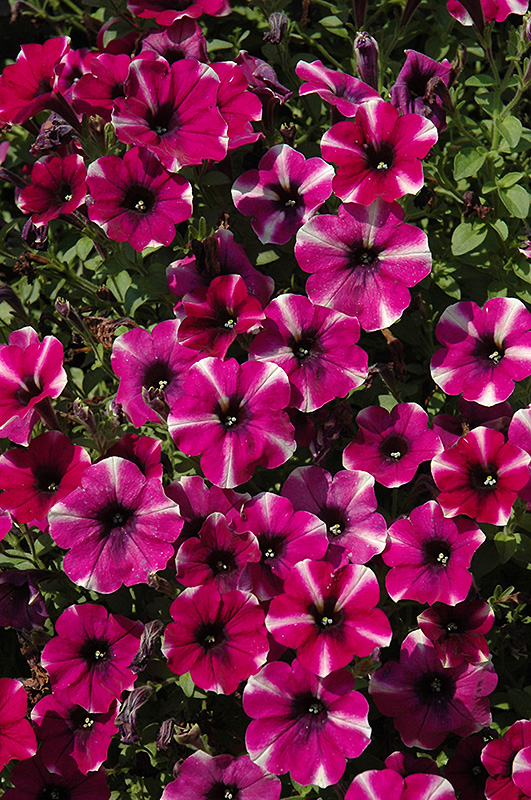 Peppy Neon Petunia is covered in stunning fuchsia trumpet-shaped flowers with white stripes at the ends of the stems from mid spring to late summer. Its pointy leaves remain green in colour throughout the season.