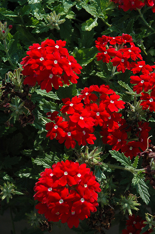 Fuego Red plus Eye Verbena features showy clusters of red star-shaped flowers with white eyes at the ends of the stems from late spring to mid fall. The flowers are excellent for cutting. Its tiny tomentose narrow leaves remain green in colour throughout the season.