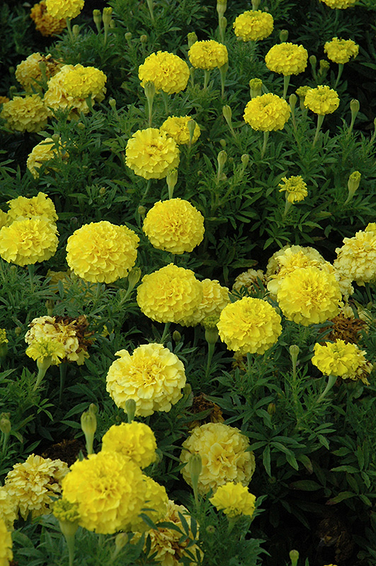 Lady First Marigold features bold fully double yellow ball-shaped flowers at the ends of the stems from early summer to mid fall. The flowers are excellent for cutting. Its fragrant ferny leaves remain dark green in colour throughout the season.