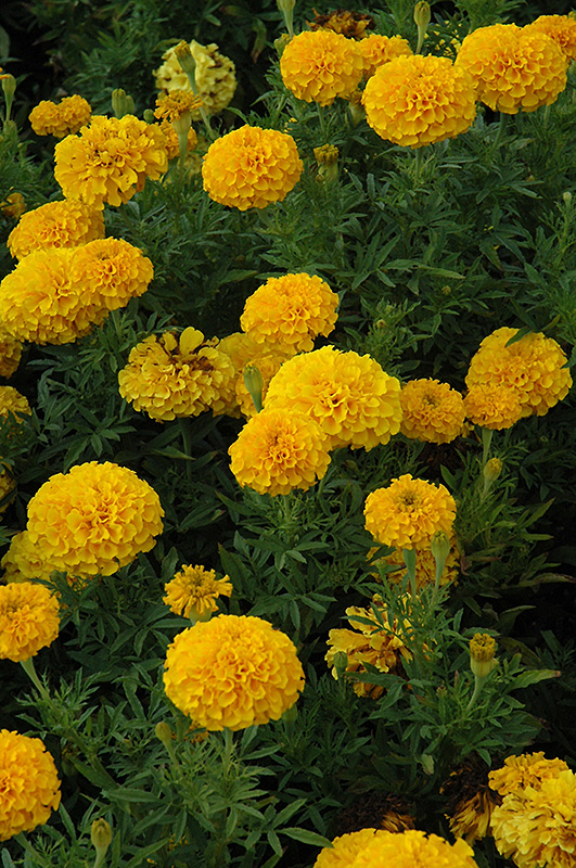 Lady Gold Marigold features bold fully double gold ball-shaped flowers at the ends of the stems from early summer to mid fall. The flowers are excellent for cutting. Its fragrant ferny leaves remain dark green in colour throughout the season.